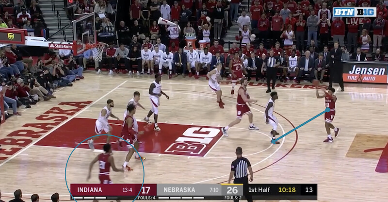 Later in the first half with the Hoosiers trailing by nine, Rob Phinisee passes to Jerome Hunter on the left wing: