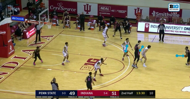 John Harrar comes up to set a high ball screen for Sessoms with Jackson-Davis ready for the hedge: