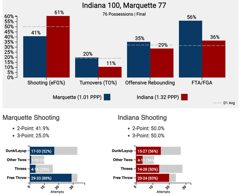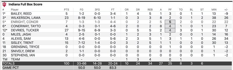 Indiana scorched the nets from distance, finishing 14-for-28 on 3-pointers, good for 50 percent. The Hoosiers were also excellent from the free-throw line with a 20-for-24 performance from the stripe. IU also committed just eight turnovers.