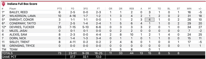 DeVries scored 17 of his game-high 25 points in the second half. He was 7-for-15 from the field, including 5-for-10 on 3s and 6-for-6 from the free-throw line in 34 minutes.