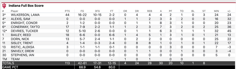 Wilkerson’s 10th 3-pointer of the game, which came with 5:31 to play, set a program record. He left with 44 points, setting a single-game scoring record in Assembly Hall as IU cruised to its eighth win of the season.
