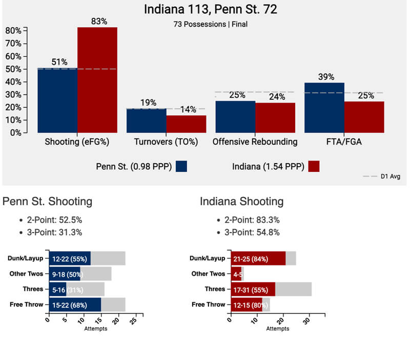 Indiana shot 17-for-31 on 3-pointers, good for 54.8 percent. The Hoosiers scored 1.54 points per possession in the blowout win.